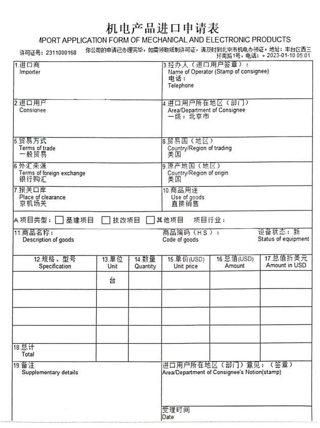 機(jī)電產(chǎn)品進(jìn)口申請(qǐng)表(樣例)