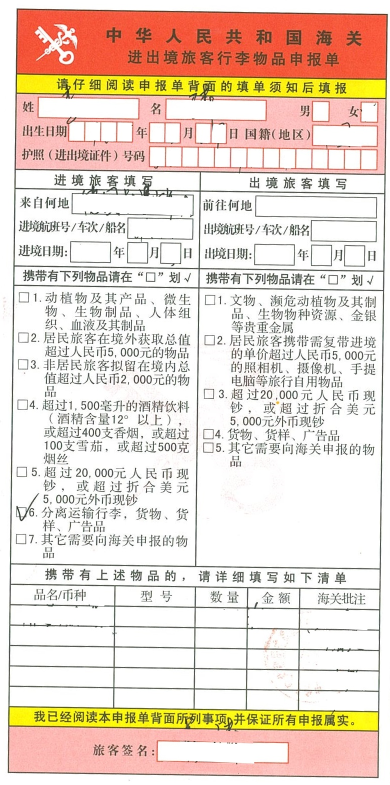 中華人民共和國(guó)海關(guān)進(jìn)出境旅客行李物品申報(bào)單(樣例)
