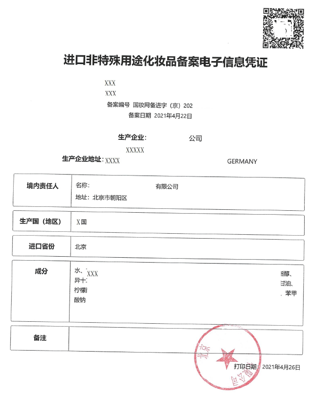 進(jìn)口非特殊用途化妝品備案電子信息憑證(樣例)