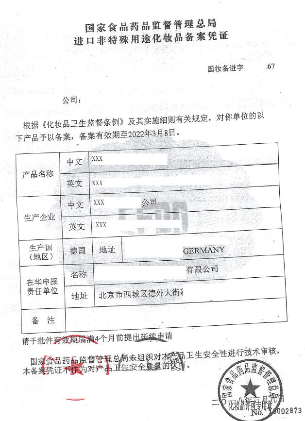 進口非特殊用途化妝品備案憑證(樣例)