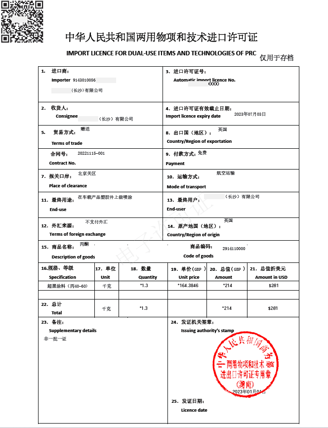 中華人民共和國兩用物項和技術(shù)進口許可證(樣例)
