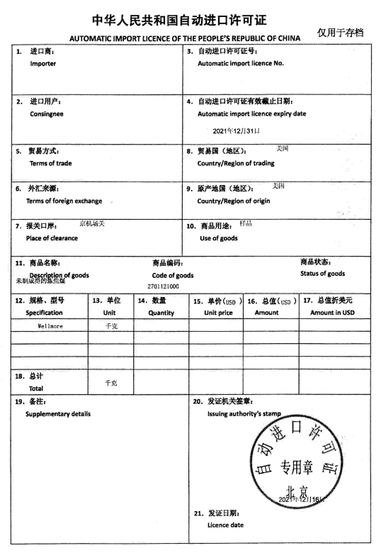 礦產(chǎn)資源-自動進口許可證(樣例)