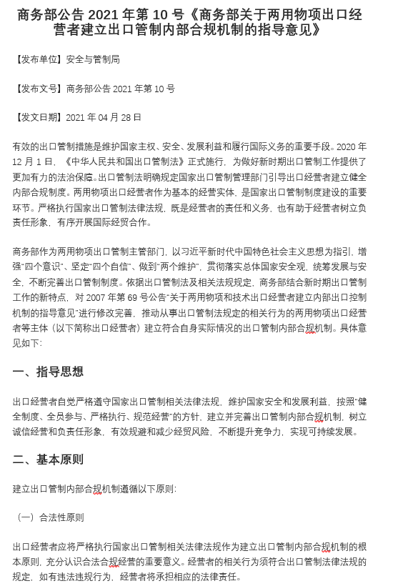 商務(wù)部公告2021年第10號《商務(wù)部關(guān)于兩用物項出口經(jīng)營者建立出口管制內(nèi)部合規(guī)機制的指導意見》