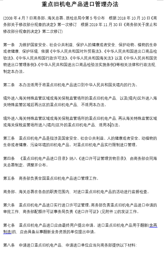 重點舊機電產(chǎn)品進口管理辦法