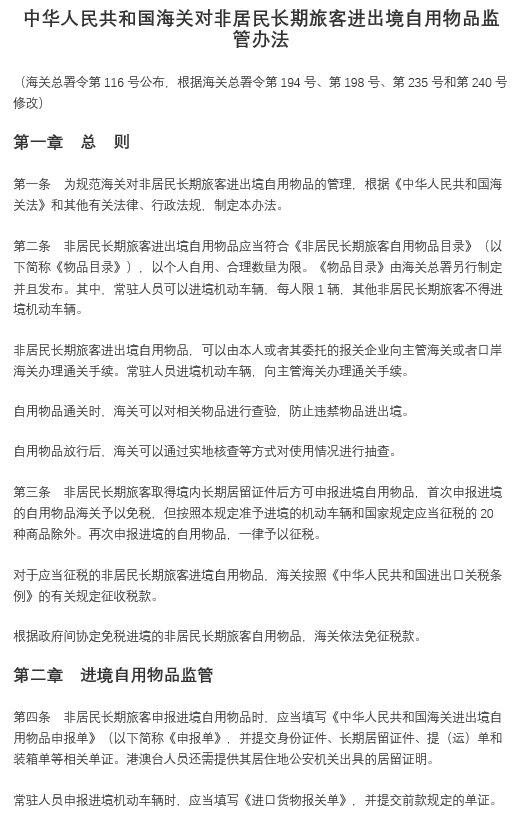 中華人民共和國海關(guān)對非居民長期旅客進(jìn)出境自用物品監(jiān)管辦法
