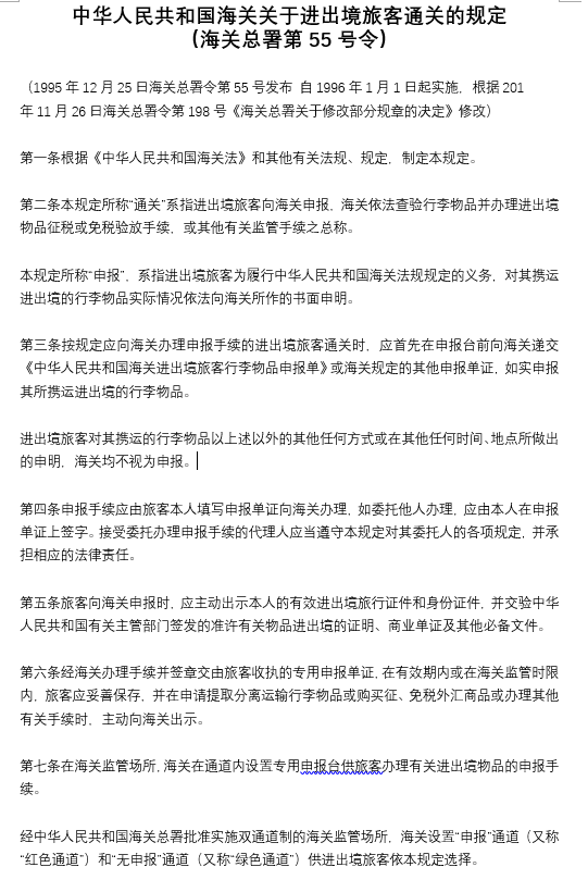 中華人民共和國海關關于進出境旅客通關的規(guī)定 (海關總署第55號令)